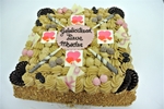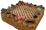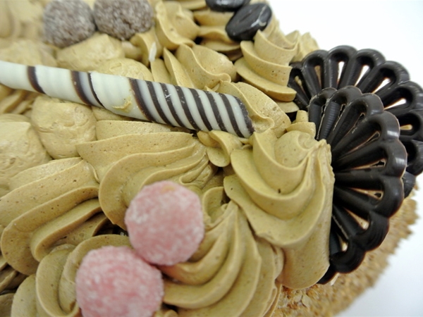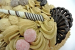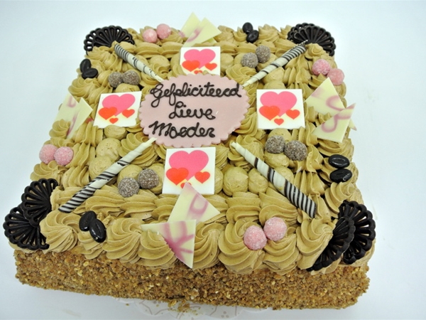 Deze taart is gevuld met gele room, mokka crème en karamel. Opgespoten met mokka crème en de randen zijn aangezet met nootjes.